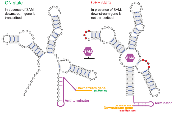 Un riboswitch agit comme un capteur biologique, changeant sa forme 3D d’un état « ON » (à gauche) à un état « OFF » (à droite) lorsqu’il se lie à un métabolite (SAM, hexagone violet). Les chercheurs du CNRS ont utilisé un modèle d’apprentissage automatique pour apprendre les règles de conception de ce commutateur, ce qui leur a permis de créer à partir de zéro des molécules artificielles fonctionnelles entièrement nouvelles.