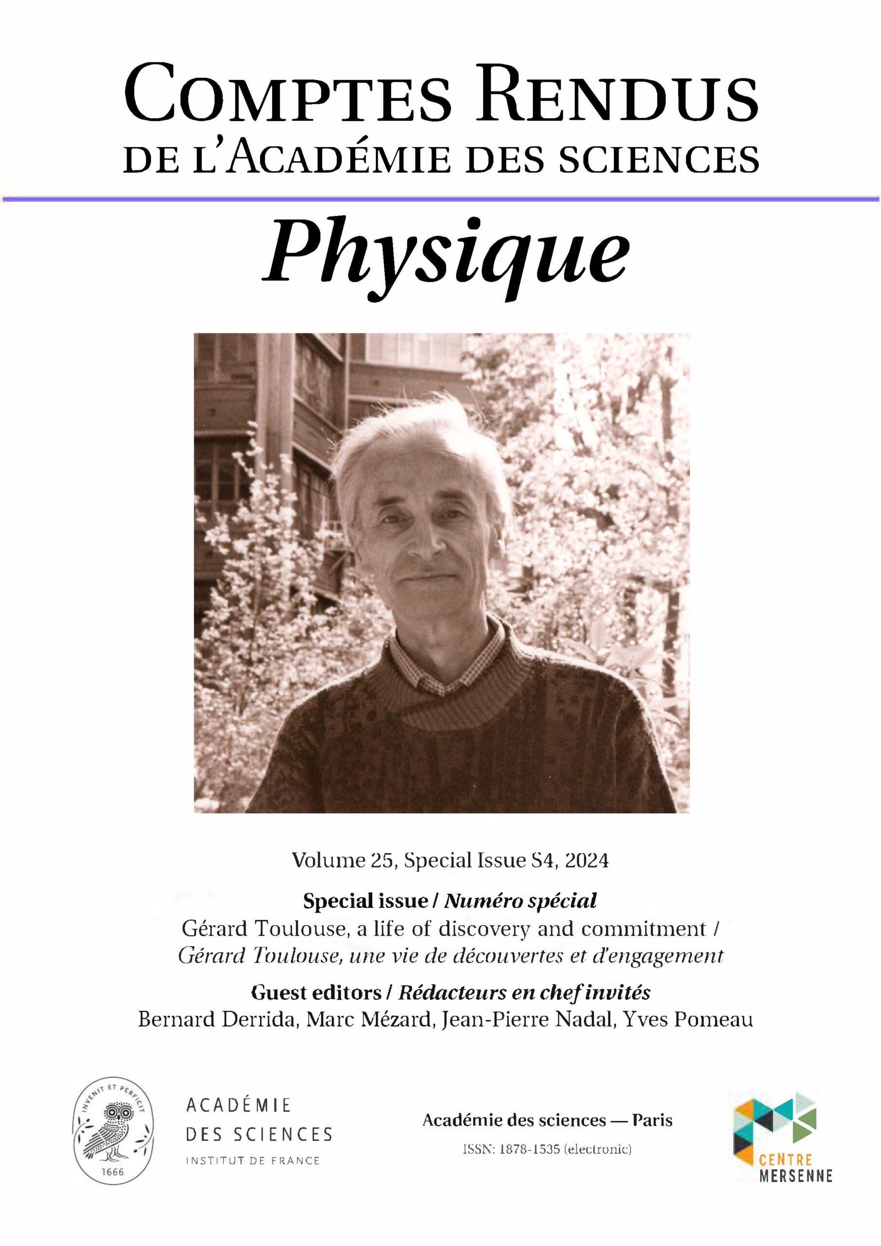 Réf. : Bernard Derrida, Marc Mézard, Jean-Pierre Nadal & Yves Pomeau (éd.). Gérard Toulouse, une vie de découvertes et d’engagement, Comptes Rendus. Physique, Volume 25 (2024) no. S4, doi : 10.5802/crphys.sp.1.
